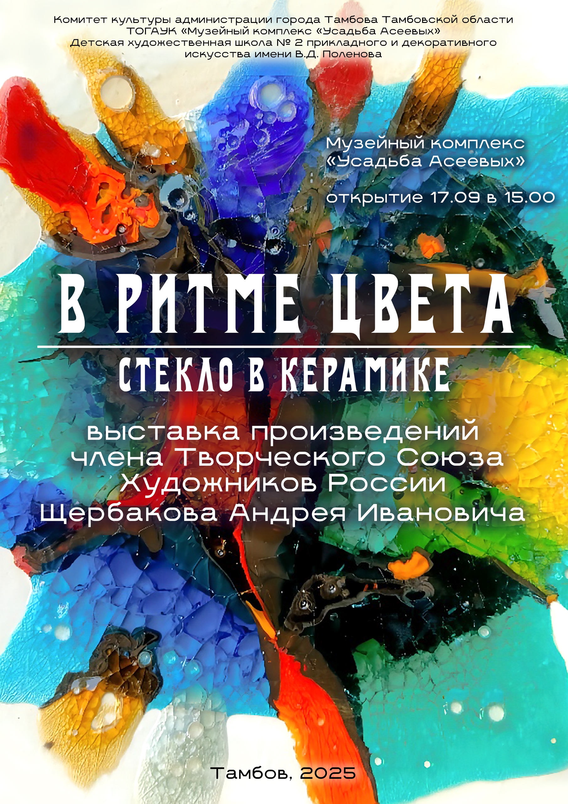 17 сентября 2025 года в 15.00 в Музейном комплексе «Усадьба Асеевых» состоится открытие выставки художника, члена Творческого Союза Художников России, Щербакова А.И. под названием «В ритме цвета». Андрей Иванович в настоящее время работает преподавателем скульптуры и керамики Детской художественной школы № 2 прикладного и декоративного искусства имени В.Д. Поленова.